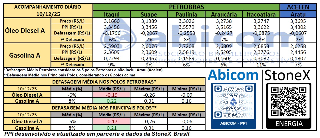 Premissas: o preço de paridade de importação (ppi) foi desenvolvido e é atualizado em parceria com a StoneX Brasil para os dados dos valores de referência para gasolina, óleo diesel, câmbio, RVO e frete marítimo considerando a abertura do mercado no dia 09/12/2025.