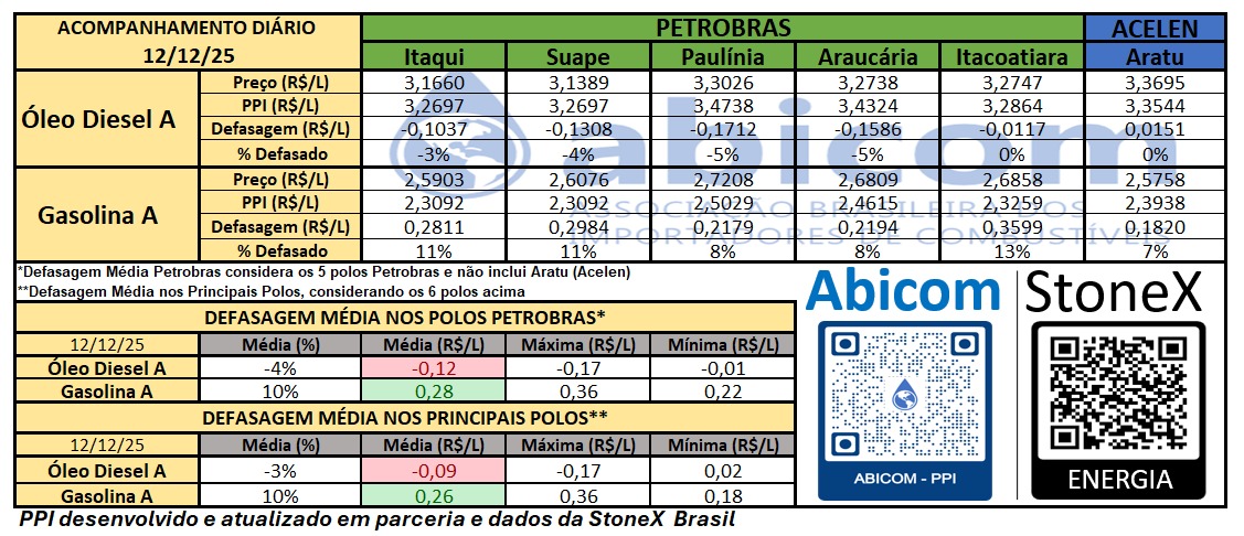 Premissas: o preço de paridade de importação (ppi) foi desenvolvido e é atualizado em parceria com a StoneX Brasil para os dados dos valores de referência para gasolina, óleo diesel, câmbio, RVO e frete marítimo considerando a abertura do mercado no dia 11/12/2025.