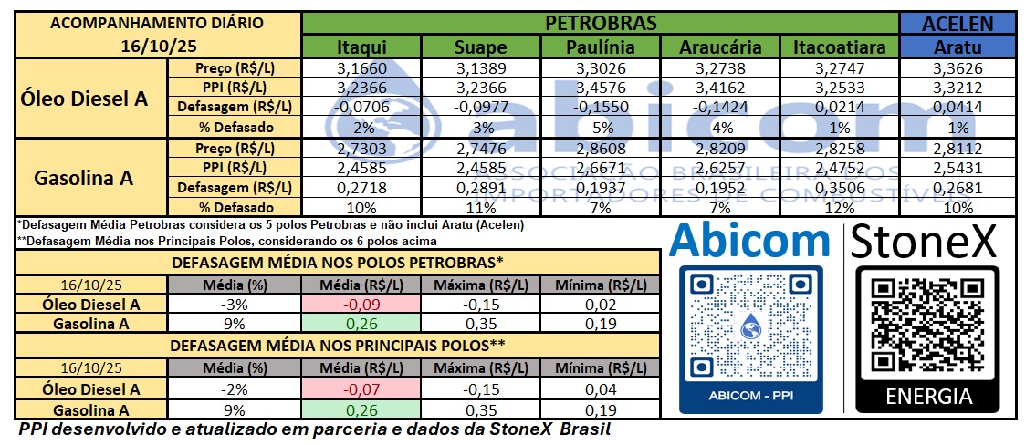 Premissas: o preço de paridade de importação (ppi) foi desenvolvido e é atualizado em parceria com a StoneX Brasil para os dados dos valores de referência para gasolina, óleo diesel, câmbio, RVO e frete marítimo considerando a abertura do mercado no dia 15/10/2025.