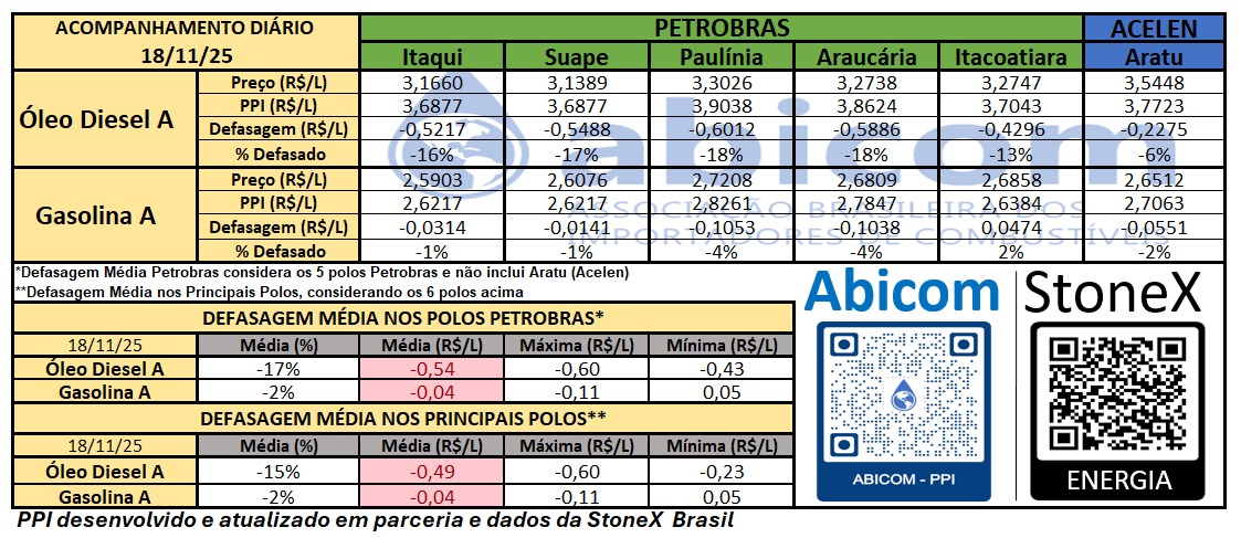 Premissas: o preço de paridade de importação (ppi) foi desenvolvido e é atualizado em parceria com a StoneX Brasil para os dados dos valores de referência para gasolina, óleo diesel, câmbio, RVO e frete marítimo considerando a abertura do mercado no dia 17/11/2025.
