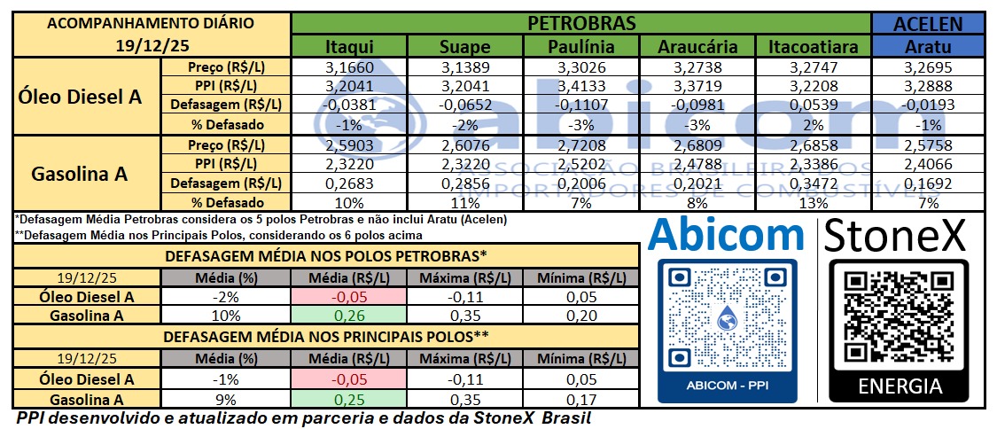 Premissas: o preço de paridade de importação (ppi) foi desenvolvido e é atualizado em parceria com a StoneX Brasil para os dados dos valores de referência para gasolina, óleo diesel, câmbio, RVO e frete marítimo considerando a abertura do mercado no dia 18/12/2025.