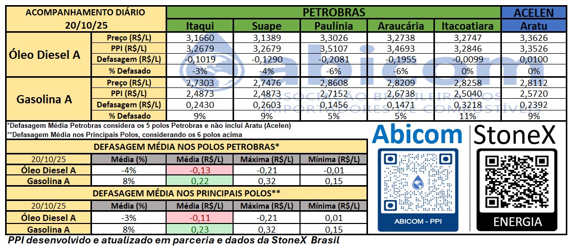Premissas: o preço de paridade de importação (ppi) foi desenvolvido e é atualizado em parceria com a StoneX Brasil para os dados dos valores de referência para gasolina, óleo diesel, câmbio, RVO e frete marítimo considerando a abertura do mercado no dia 17/10/2025.