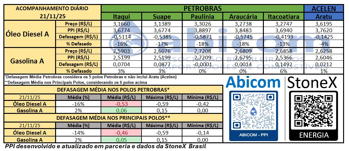 Premissas: o preço de paridade de importação (ppi) foi desenvolvido e é atualizado em parceria com a StoneX Brasil para os dados dos valores de referência para gasolina, óleo diesel, câmbio, RVO e frete marítimo considerando a abertura do mercado no dia 20/11/2025.