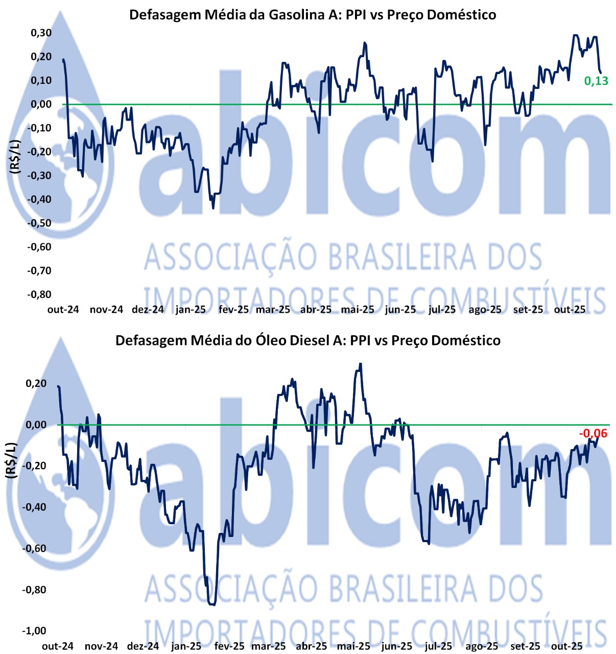 Cenário: com a redução no câmbio e a estabilidade os preços de referência do óleo diesel e da gasolina no mercado internacional no fechamento do dia útil anterior. Considerando a redução linear de 0,14 R$/L no preço da gasolina praticado pela Petrobras a partido do dia 21/10/2025, o cenário médio de preços está acima da paridade para a gasolina e abaixo dela para o óleo diesel. Defasagem média de -3% no Óleo Diesel e de 5% para a Gasolina.
