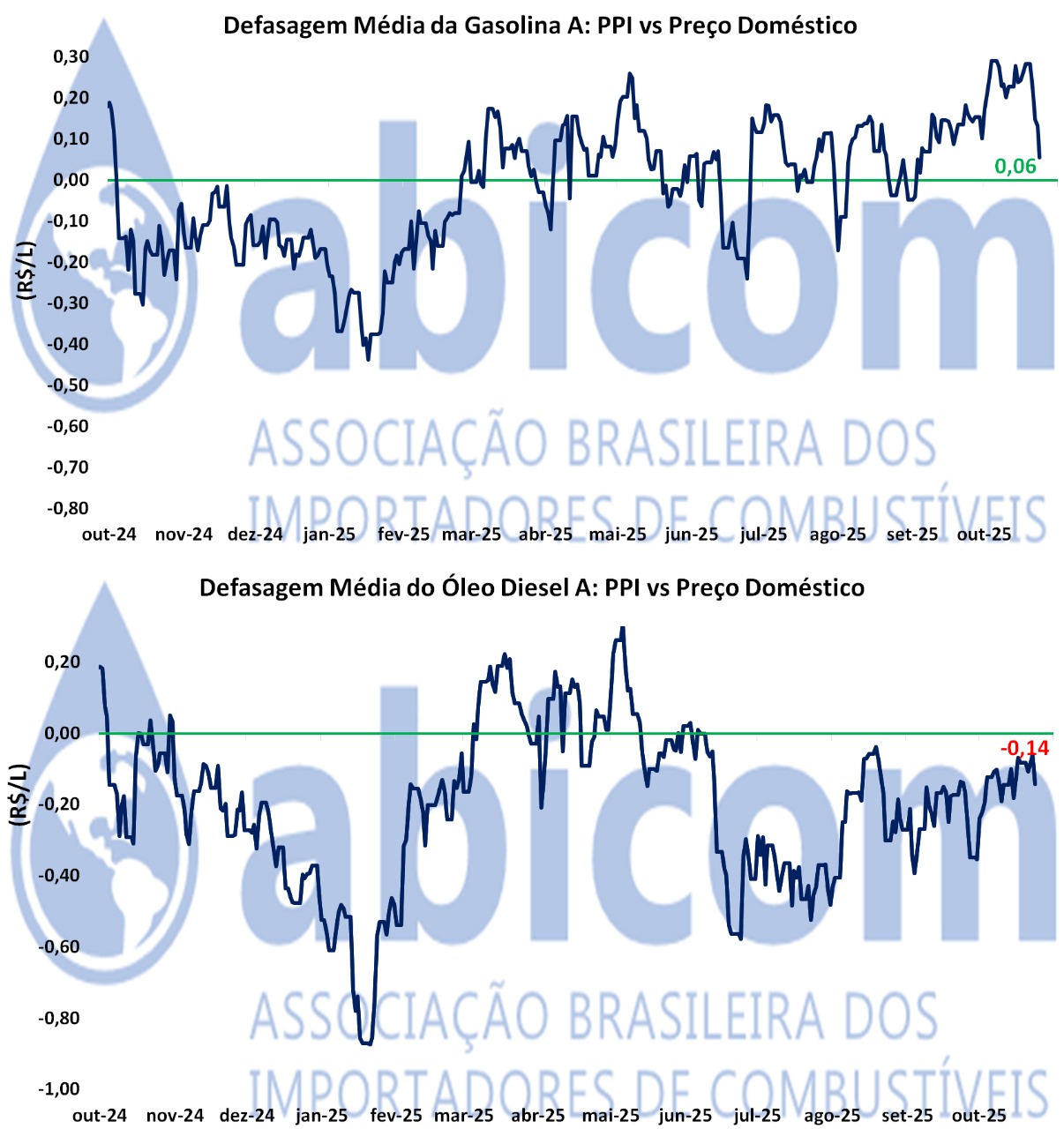 Cenário: com a estabilidade no câmbio e a ligeira valorização nos preços de referência do óleo diesel e da gasolina no mercado internacional no fechamento do dia útil anterior. Considerando a redução linear de 0,14 R$/L no preço da gasolina praticado pela Petrobras a partido do dia 21/10/2025, o cenário médio de preços está acima da paridade para a gasolina e abaixo dela para o óleo diesel. Defasagem média de -4% no Óleo Diesel e de 2% para a Gasolina.