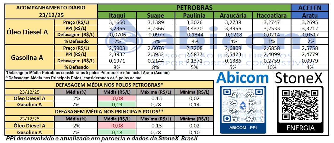 Premissas: o preço de paridade de importação (ppi) foi desenvolvido e é atualizado em parceria com a StoneX Brasil para os dados dos valores de referência para gasolina, óleo diesel, câmbio, RVO e frete marítimo considerando a abertura do mercado no dia 22/12/2025.