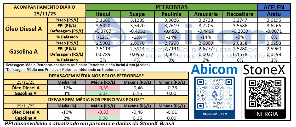 Premissas: o preço de paridade de importação (ppi) foi desenvolvido e é atualizado em parceria com a StoneX Brasil para os dados dos valores de referência para gasolina, óleo diesel, câmbio, RVO e frete marítimo considerando a abertura do mercado no dia 24/11/2025.