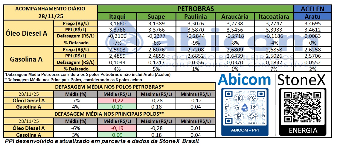 Premissas: o preço de paridade de importação (ppi) foi desenvolvido e é atualizado em parceria com a StoneX Brasil para os dados dos valores de referência para gasolina, óleo diesel, câmbio, RVO e frete marítimo considerando a abertura do mercado no dia 27/11/2025.