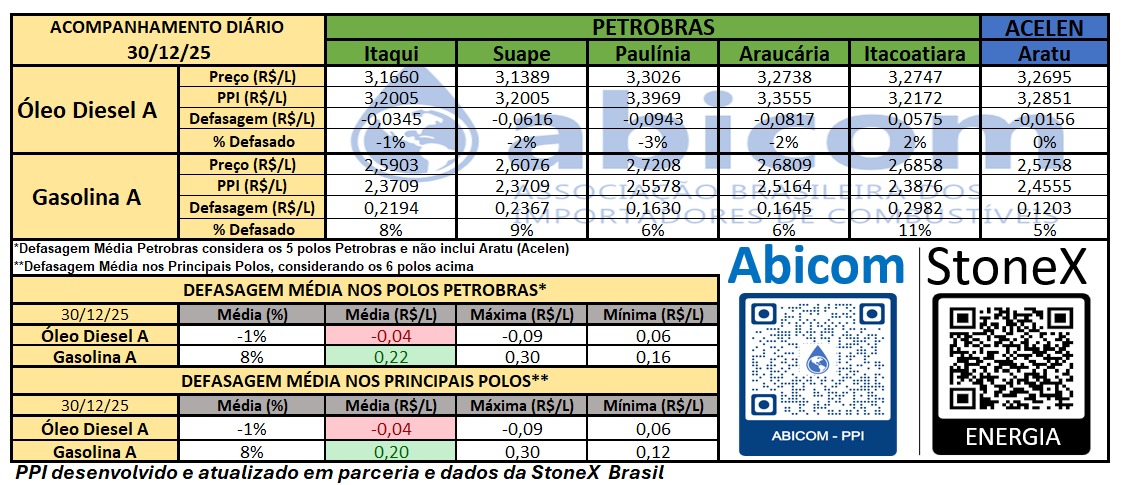 Premissas: o preço de paridade de importação (ppi) foi desenvolvido e é atualizado em parceria com a StoneX Brasil para os dados dos valores de referência para gasolina, óleo diesel, câmbio, RVO e frete marítimo considerando a abertura do mercado no dia 29/12/2025.